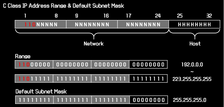 C Class 가 사용하는 기본 서브넷 마스크는 255.255.225.0이며 호스트 아이디가 8bit 이므로 네트워크 id 당 나올 수 있는 IP 주소 개수는 2^8개 (즉, 256개가 된다)