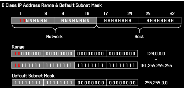 - B 클래스의 IP주소는 첫 번째 옥텟이 128 ~ 191.