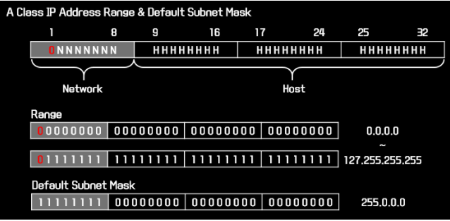 - A 클래스의 IP주소는 첫 번째 옥텟이 0 ~ 127.