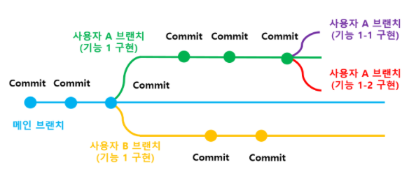 물론 다음과 같이 한 사용자가 자신의 기능의 세부 브랜치를 또 다시 나눌 수도 있다.