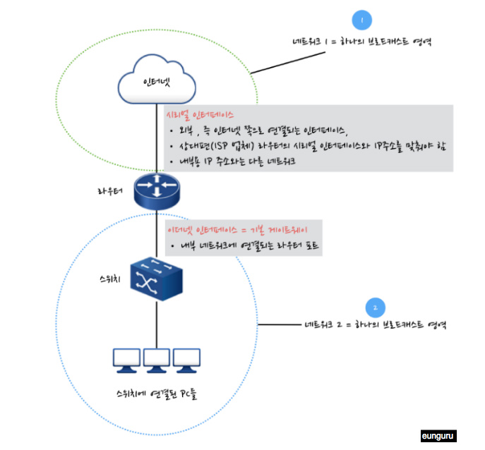 - 여기서 하나의 네트워크란 하나의 브로드캐스트 영역이라고 생각하면 된다. 라우터를 거치지 않고도 통신이 가능한 영역.