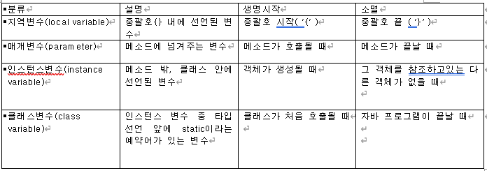 - 인스턴스 변수는 클래스영역 내에 선언되며 클래스의 인스턴스(객체)를 생성할 때 만들어진다.